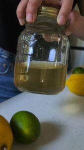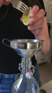 2. Into your swing top bottles, add the juice of your lemons and limes. Add your simple syrup. Add mint leaves. Add filtered water, followed by your active ginger bug.